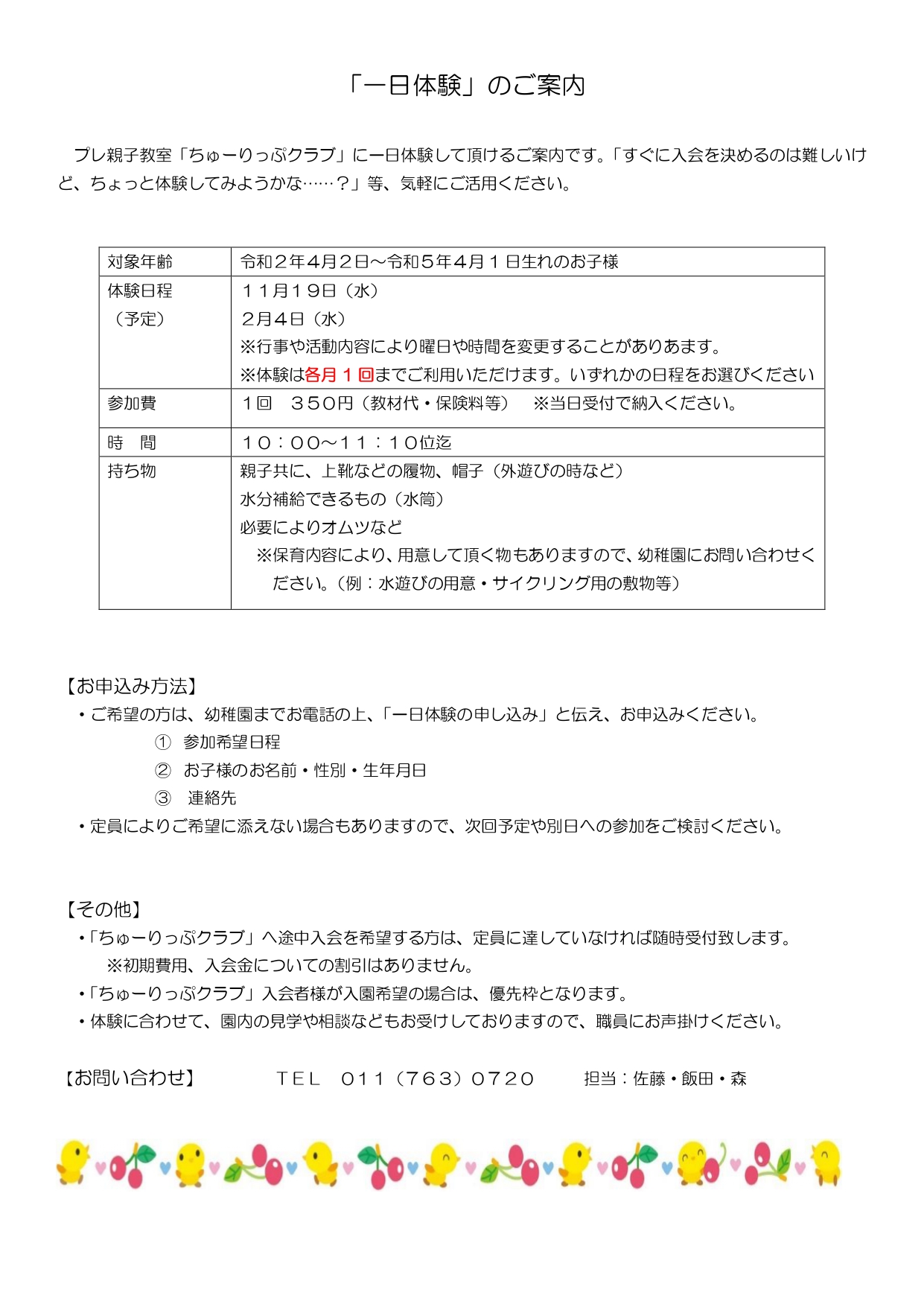 令和8年度 未就園児プレ教室「ちゅーりっぷクラブ」募集のご案内
